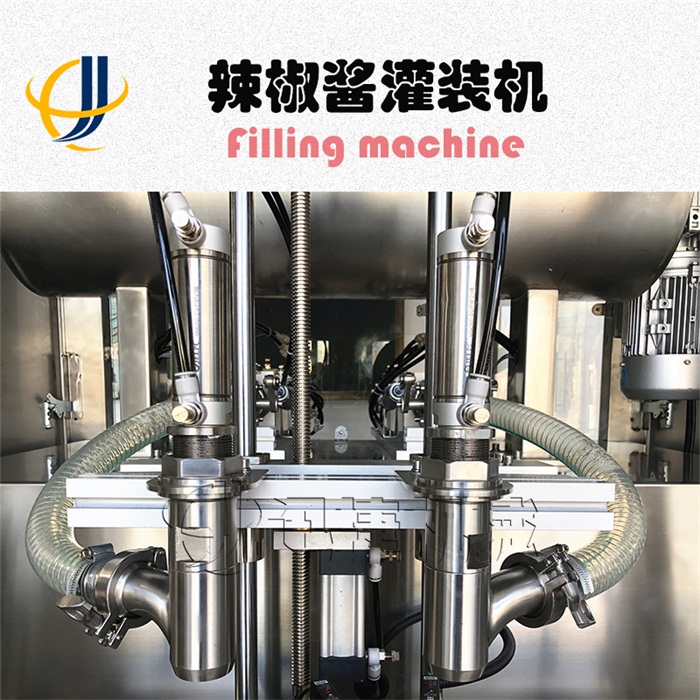 接下來就是辣椒醬灌裝機了,辣椒醬灌裝機可以根據自己的生產量來選擇灌裝頭數(一般是四頭,六頭,八頭)。可以灌裝辣椒醬、蕃茄醬、花生醬、果醬蜂蜜、果肉飲料以及各類膏狀物料。其中重點介紹一下辣椒醬灌裝機。